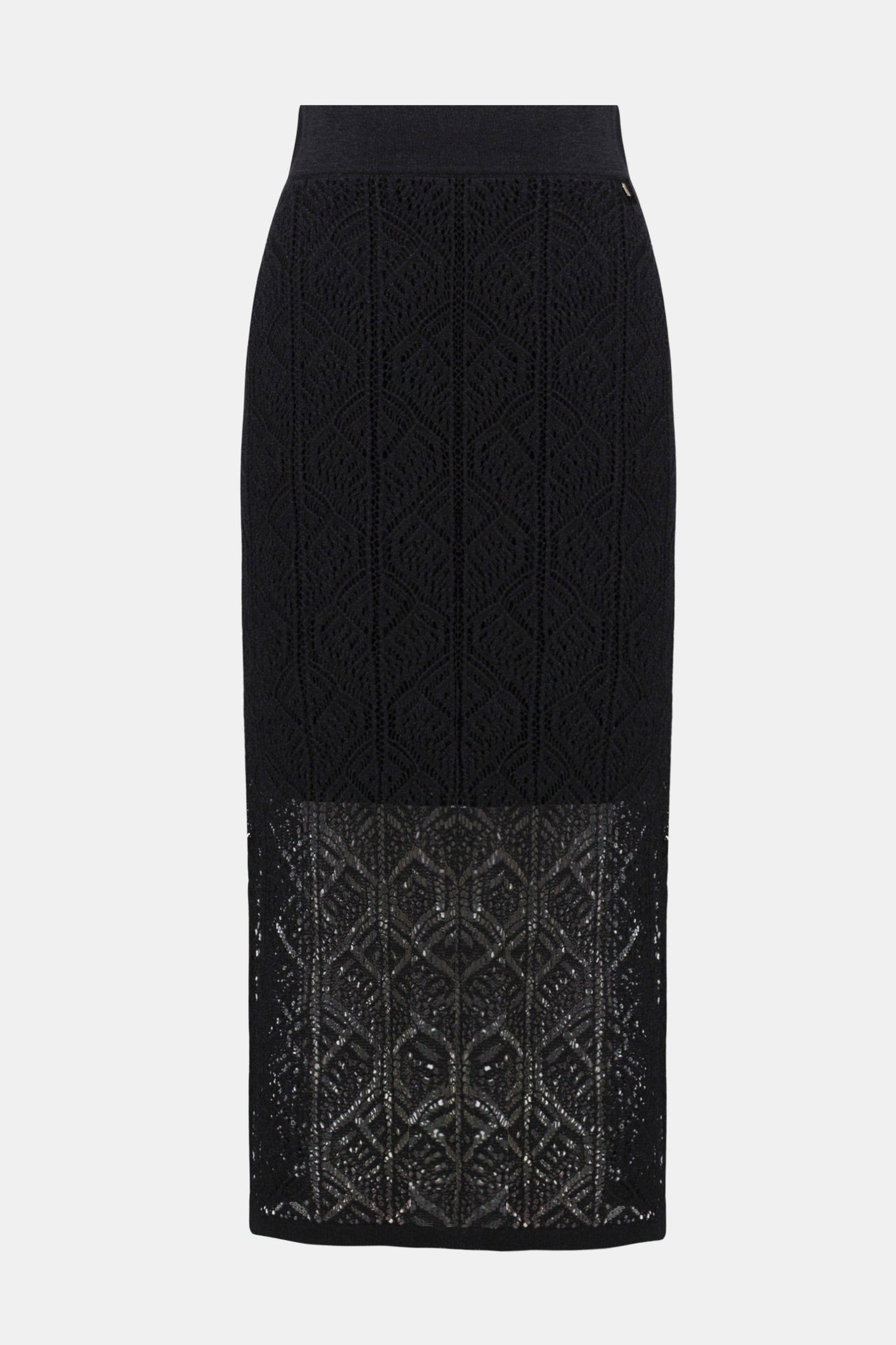 This cotton blend sweater knit skirt features an open stitch design with a pencil silhouette. Side slits and an inserted elastic waistband ensure a comfortable fit, while the knit lining adds structure and ease. Fabric composition: 43% Cotton, 31% Lyocell, 26% Paper fibre