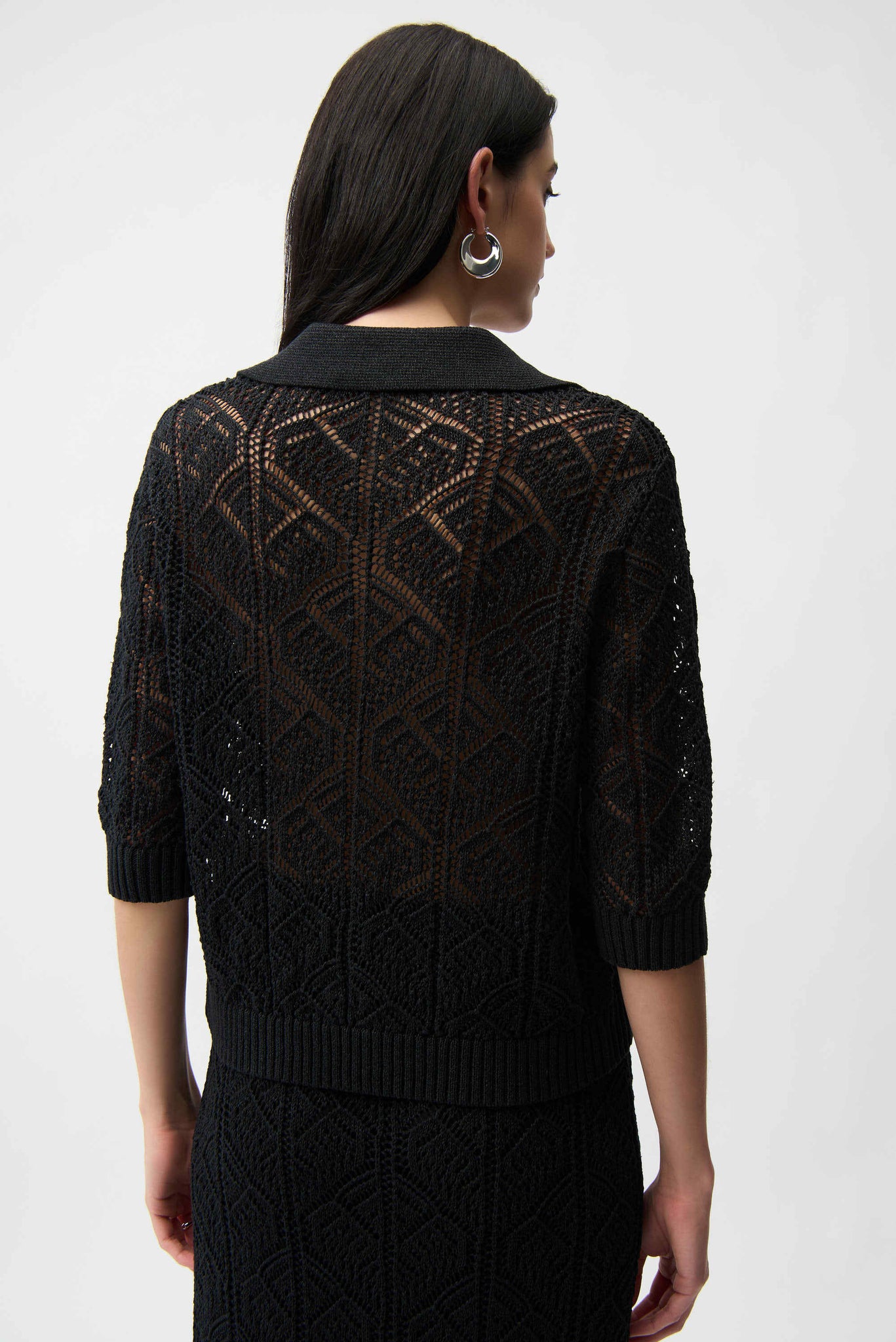 This cotton blend open stitch sweater features a fitted body and a polo collar. With elbow-length sleeves and rib trim, it combines comfort and style in a sleek, versatile design. Fabric composition: 43% Cotton, 31% Lyocell, 26% Paper fibre