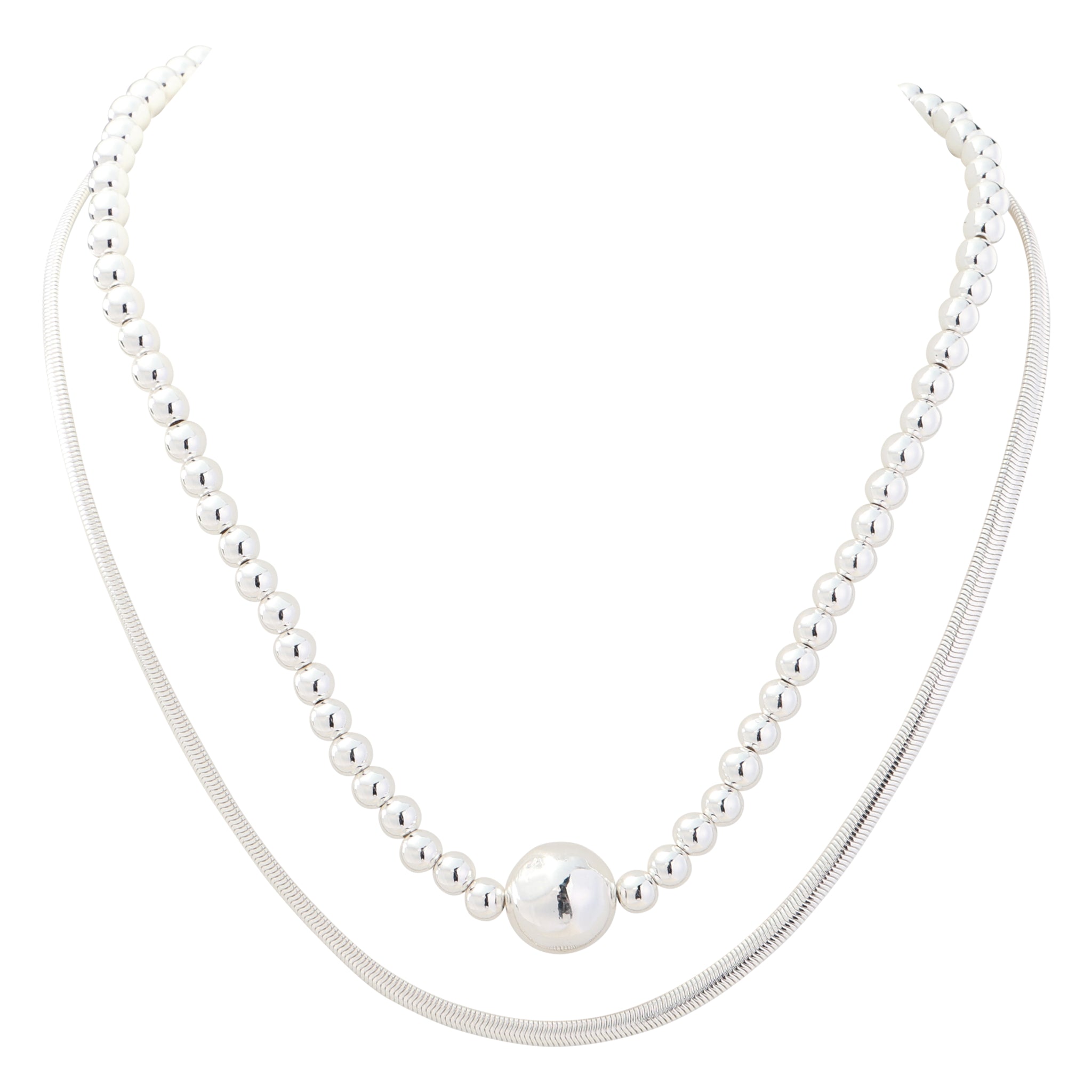 Merx Double Strand Necklace with Ball Pendant in Shiny Gold or Shiny Silver. One Flat Chain & One Small Ball Strand. Lobster Claw Closure.