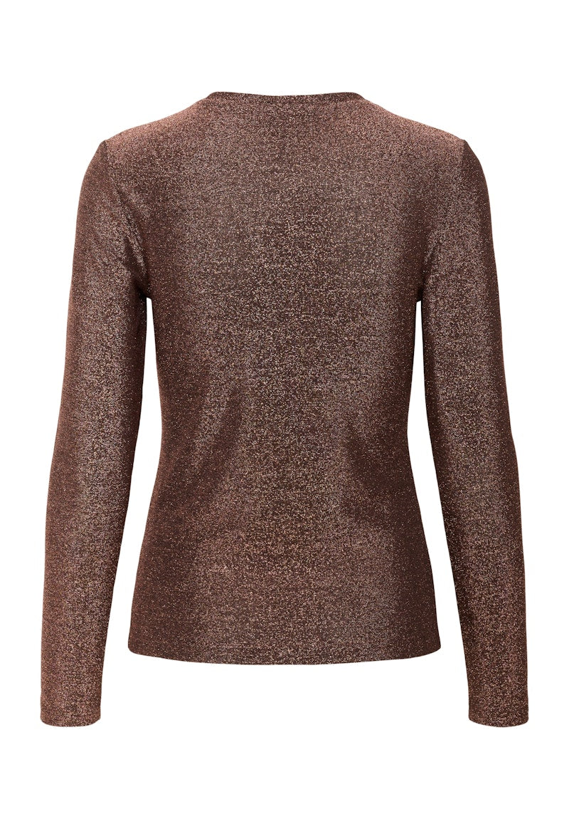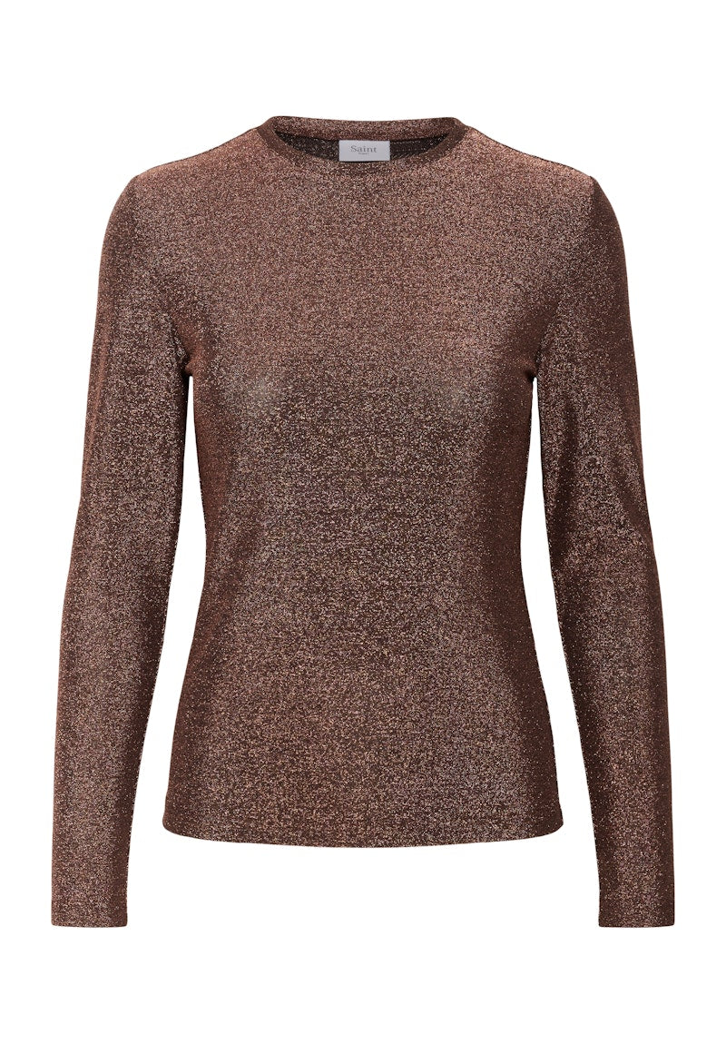 Saint Tropez Long sleeve top features a fitted silhouette with a subtle sheen. Classic round neckline and straight hem create a timeless, streamlined look. The fabric has a smooth, slightly shimmering finish for added visual interest. Fabric composition: 55% Polyamide, 40% Metallic Yarn, 5% Elastane